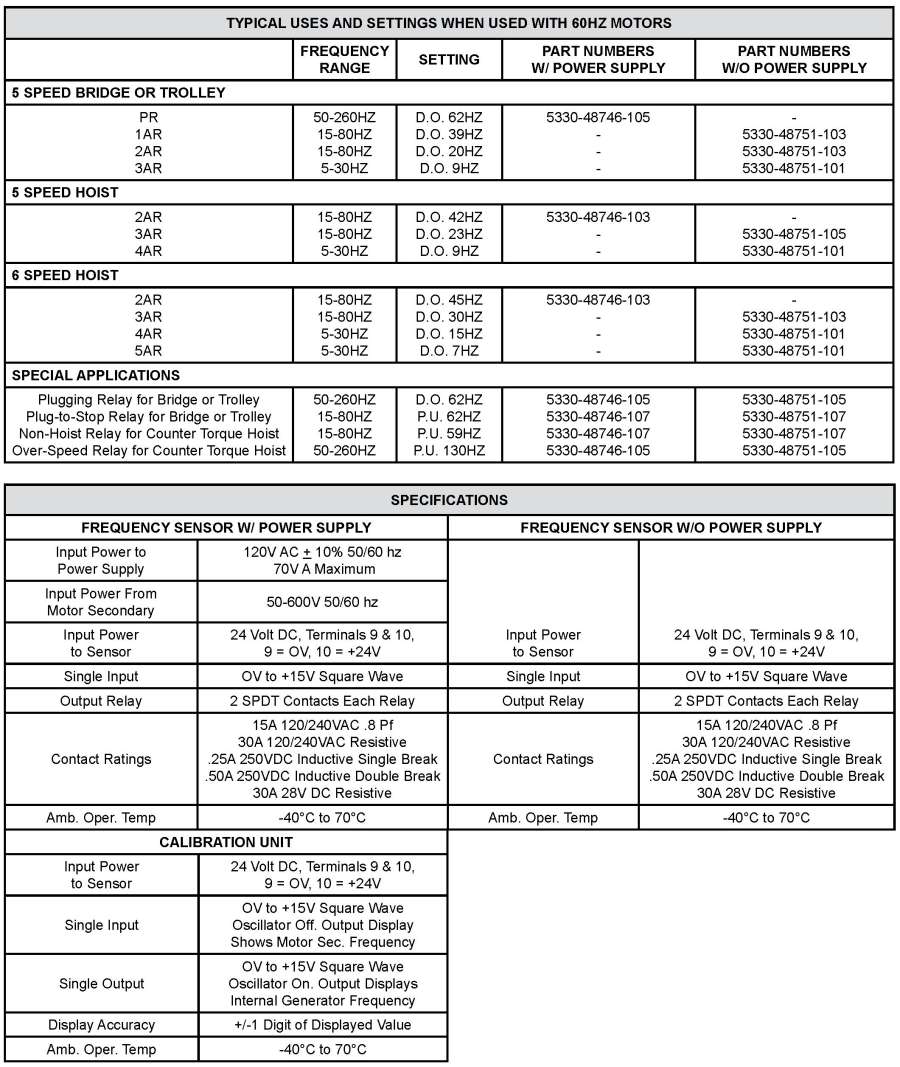 FREQUENCY SENSOR 5330, TYPICAL USES AND SETTINGS WHEN USED WITH 60HZ MOTORS